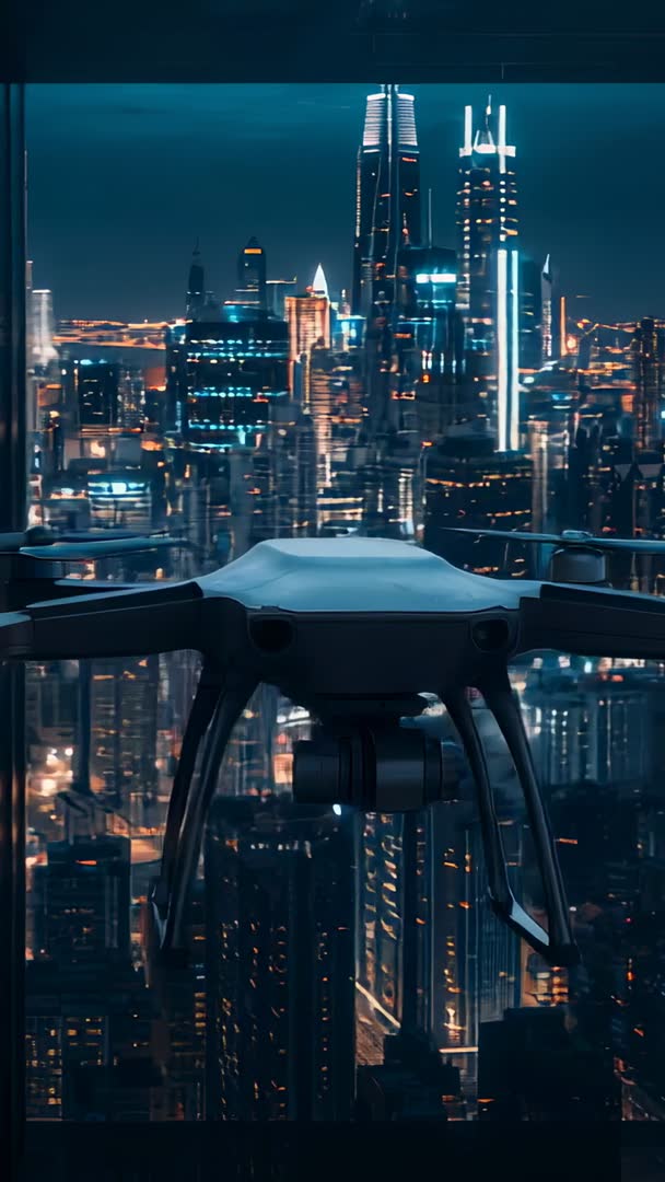 AI Generated Video. Showing gliding quadcopter launching from highrise window while sliding forward gimbal capturing neon-lit skyline at night. Cinematic camera movement and high-contrast city lights creating dramatic urban mood. Suitable for tech commercials, smart city campaigns, drone product demos, real estate presentations, travel and tourism promos, futuristic city sequences in films, social media vertical ads, app intros and broadcast openers. Recommend using for vertical social formats, mobile ads, Instagram Reels, TikTok and full-screen mobile backgrounds. Leave top third clear for title and lower third for logo and call-to-action. Color grade toward teal-orange look or push cool blue tones to enhance neon atmosphere. Provide timecode and loopable segments for background playback. Frame aspect ratio 9:16 vertical, ideal for short-form clips 6-60 seconds.