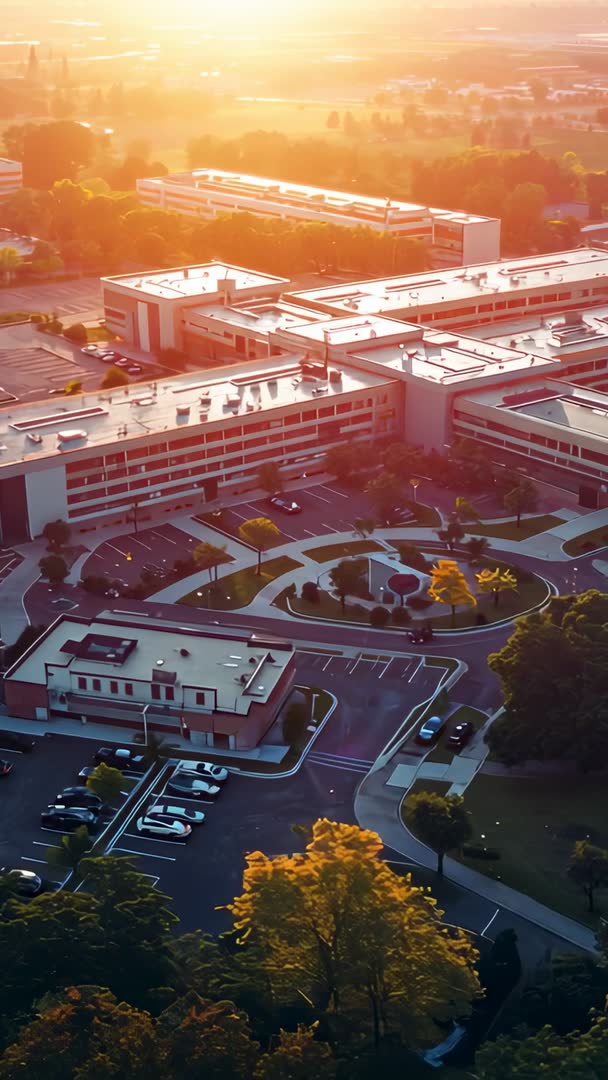 AI Generated Video. Showing gliding drone revealing campus plaza, layered rooftops, and rooftop HVAC units during golden hour. Capturing warm sunlight reflecting on building surfaces, landscaped courtyard, and organized parking layout from high-angle vertical perspective. Featuring vertical 9:16 frame optimized for mobile-first platforms and social vertical ads. Use cases: Opening shot for university recruitment videos, campus tour reels, and admissions social campaigns. Supporting facilities management and roof inspection workflows by highlighting HVAC locations, access points, and rooftop equipment. Providing background visual for real estate marketing, urban planning presentations, corporate campus branding, and infrastructure showcases. Supplying eye-catching footage for Instagram Reels, TikTok, YouTube Shorts, and mobile landing pages. Production notes: Offering gentle camera glide, soft warm color palette, and clear rooftop detail. Recommending subtle color grading to enhance warm tones and adding ambient soundtrack or short voiceover for promotional use. Including timecode and GPS metadata for facility asset tracking and inspection documentation.