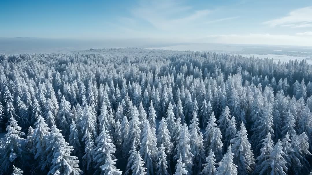 AI Generated Video. Footage capturing gliding drone sweeping over snow-covered fir forest, showing endless frosted canopy and distant horizon under pastel blue sky. Cinematic slow pan creating calm, immersive mood and highlighting texture of snow-laden branches and rhythmic tree rows. Serving winter tourism commercials, environmental documentaries, seasonal social media campaigns, travel vlogs, real estate promotions for mountain cabins, and nature background loops for broadcast or web. Crop for hero header, loop for ambient background, or combine with ambient soundtrack for calming opener or transition shot. Color palette offering cool blues and soft whites, suitable for winter palettes and conservation messaging.