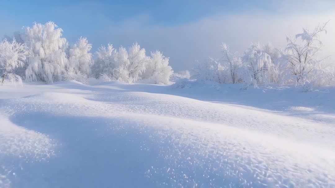 AI Generated Video. Forward glide shot revealing textured snow drifts flowing across frozen meadow toward frost-covered shrubs under clear blue sky. Soft morning light creating sparkling highlights on powder snow and casting long gentle shadows across undulating surface. Low-angle perspective emphasizing depth, curvature, and pristine untouched quality while conveying cold quiet and serene atmosphere. Ideal for winter tourism promos, holiday season ads, landscape documentaries, weather segments, website hero banners, social media reels, meditation or relaxation videos, and corporate backgrounds. Useful as B-roll for environmental storytelling, climate change discussions, and seasonal product launches. Color palette featuring cool blues and soft whites, suiting modern clean design and typography overlays. Clip working well for slow-motion playback, subtle parallax effects, and cinematic transitions.