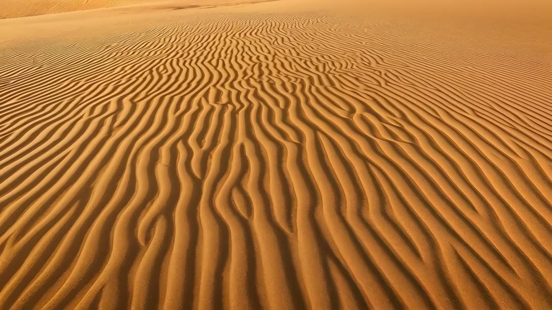 AI Generated Image. Gliding camera revealing wind-sculpted sand ripples across dune while low sun casting long shadows and warm tones. Footage focusing on repeating ridges, organic patterns, and tactile texture, creating minimal meditative composition. Use as background for website hero, social media loop, travel promo, nature documentary, mindfulness app, or interior design projection. Filming with smooth slow pan, delivering 4K-ready footage; recommend color grading toward deep orange, adding subtle vignette, and extracting loopable 8-12 second segment for continuous playback. Provide clean upper third space for title or lower third text placement. Ideal for editorial about desert landscapes, climate and erosion features, abstract design projects, and product advertising needing serene natural textures.