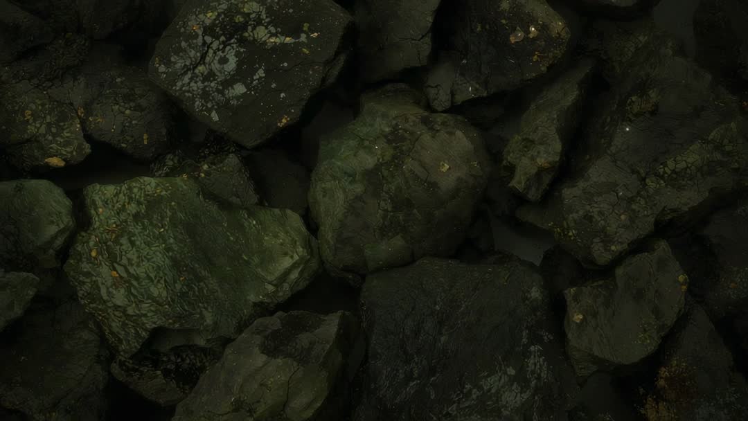AI Generated Image. Stabilized overhead footage gliding over dark wet coastal rocks covered in green algae and scattered pale lichen deposits. Closeup framing highlighting slick boulder surfaces, cracked rock faces and subtle seawater sheen, creating tactile texture and moody coastal atmosphere. Slow stabilized movement offering smooth cinematic b-roll suitable for environmental storytelling, geology content, travel films, surf and coastal lifestyle projects. Useful as background texture for web banners, title sequences, social media posts, product packaging, print editorial, or layered overlay for motion design. Clip matching low-light color grading and high-detail closeups, ideal for 4K editing timelines and seamless loopable sequences.