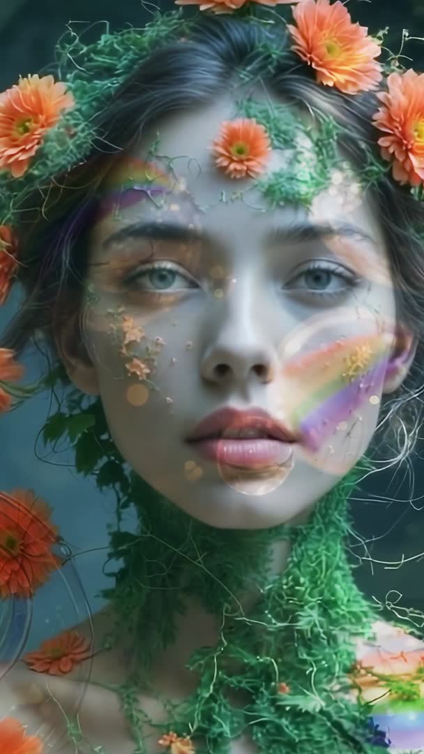 AI Generated Image. Vertical video showing gliding rainbow light across moss-wrapped model face adorned with orange blooms and delicate botanical textures. Suiting beauty campaigns, cosmetics launches, fashion editorials, and environmental or botanical storytelling. Providing vivid color contrast and intimate facial detail for Instagram Reels, TikTok content, and vertical ad placements. Offering loop-friendly motion and clear upper and lower margins for overlaying text, logos, or product information. Pairing well with ambient synth pads, soft piano, or nature soundscapes to enhance ethereal mood. Recommending slow-motion playback, subtle glow grading, and mild vignette to emphasize texture and depth. Fitting creative directors, art directors, social media teams, music video producers, and lifestyle brands seeking surreal botanical visuals.
