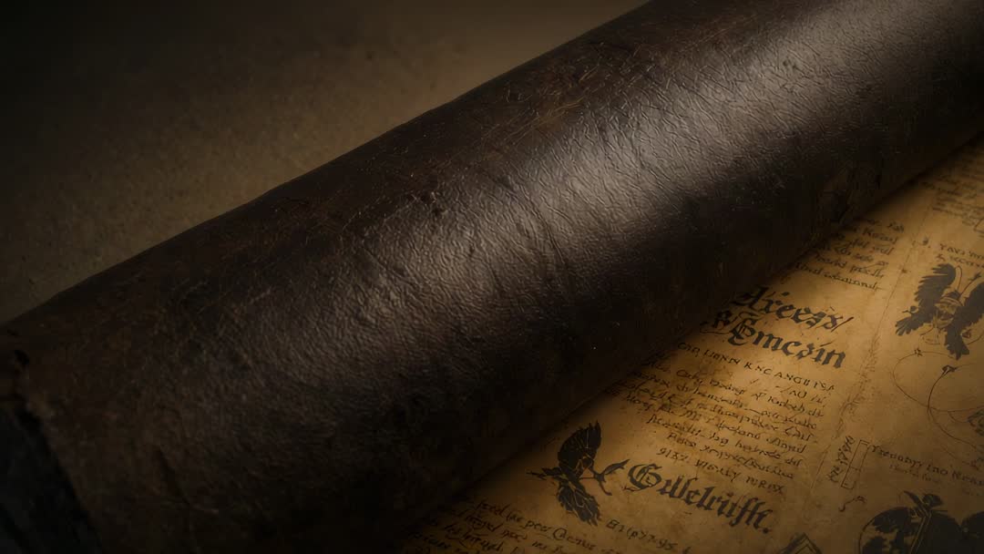 AI Generated Image. Gliding camera revealing close-up of vellum scroll unrolling from dark leather tube, warm light casting soft shadows across gothic script and heraldic crest. Rich texture of aged parchment and hand-lettered calligraphy occupying foreground, faded marginal notes and ink illustrations peeking from under curl. Low-key lighting creating cinematic mood, inviting mystery and historical atmosphere. Clip working well as dramatic opener, seamless loop for background motion, or transitional cut in longer sequences. Supporting historical documentary sequences, enhancing museum exhibit promos, anchoring book trailers and period film title sequences, illustrating conservation and restoration content, complementing fantasy game cutscenes and tabletop role-playing videos. Leaving negative space on left for overlay text and logos, while close-up texture providing visual interest for full-screen banners and printed layouts. Shot offering warm color palette and high contrast, compatible with color grading and letterbox cropping for cinematic presentation.