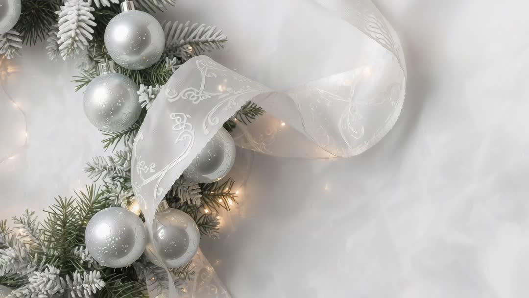 AI Generated Video. Video showing gliding reveal over frosted evergreen sprigs decorated with silver baubles, sheer white ribbon and warm fairy lights. Composition leaving generous copy space on right for titles, logos or holiday messaging. Mood combining elegant minimalist style with cozy winter glow, working well for seasonal marketing, ecommerce banners, email headers, greeting card animations, social media reels and product showcase. Editing tips: create loopable clip by matching first and last frames, produce slow-motion version for cinematic feel, apply subtle warm color grade for inviting tone or cool desaturation for modern look, add soft bokeh and gentle vignette for depth. Crop suggestions: vertical crop for mobile stories and square or wide crop for website hero and banner use. Licensing suited for commercial, editorial and promotional projects.