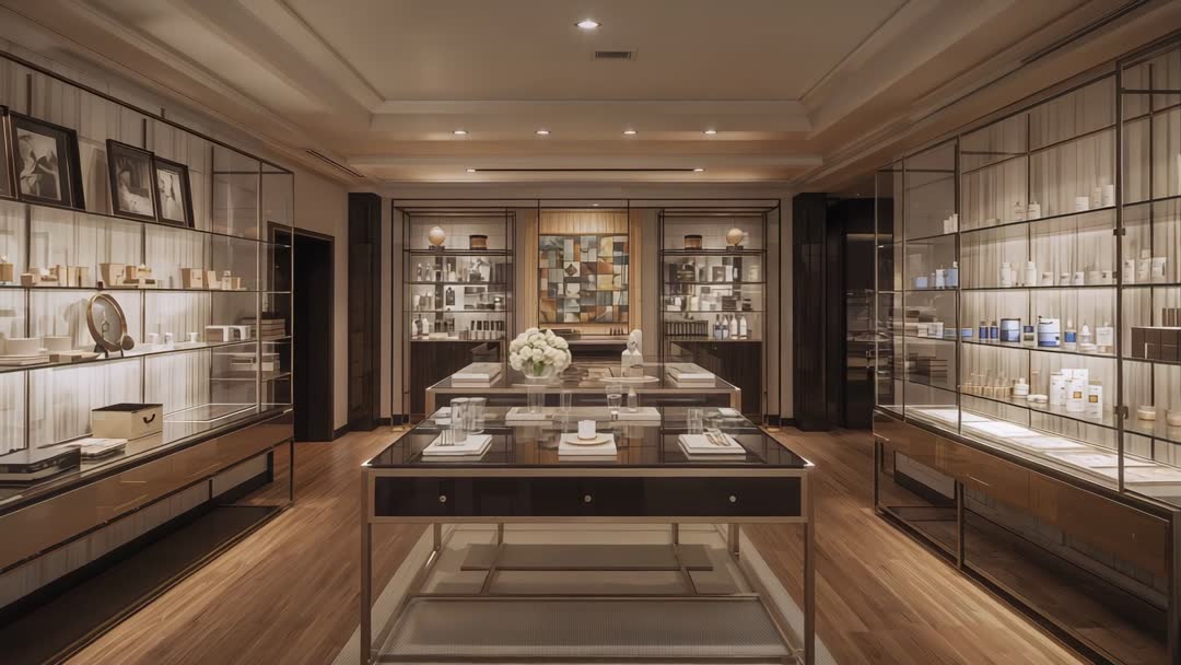 AI Generated Video. Gliding camera moving forward toward central glass table topped with white floral arrangement and stacked product boxes, creating calm, upscale boutique mood. Symmetrical composition framing long glass display cases and illuminated shelving along walls, warm wood floor adding tactile contrast, soft overhead lights highlighting curated merchandise. Scene conveying premium retail experience, quiet luxury, and meticulous merchandising detail. Serving retail marketing videos, boutique launch teasers, fragrance and skincare brand reels, interior design portfolios, showroom walkthroughs, website hero loops, social media reels, and commercial showreels. Suggested production ideas: applying slow parallax and subtle dolly easing for cinematic depth, layering soft ambient soundtrack and mellow piano for refined atmosphere, adding minimal typography for product names and pricing, and using gentle color grading toward warm tones to reinforce luxury feel. Recommend cropping for both 16:9 hero and 9:16 vertical formats for reels, preserving central composition and symmetry for strong visual impact.