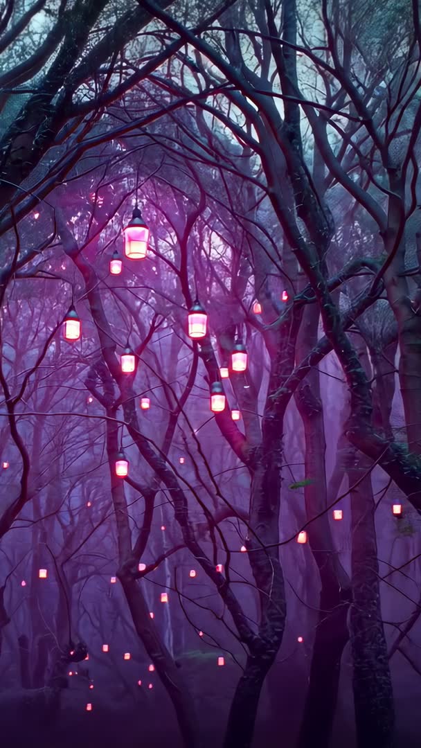 AI Generated Image. Filming as vertical video using gliding camera with slow push through misty wood, revealing cluster of glowing lanterns among twisted branches. Featuring magenta and purple tones, creating dreamy, atmospheric mood with soft fog and deep contrast. Ideal for fantasy film sequences, music video interludes, title intros, mobile app hero screens and social media stories. Serving as ambient background for meditation and wellness content, boutique retail displays, festival promotion and event projection mapping. Offering loop-friendly composition with gentle depth, supporting slow motion edits and cinematic color grading. Providing guidance for editors: extending slow push to emphasize lantern cluster, increasing contrast for moody look, or desaturating for subtle surreal feel.