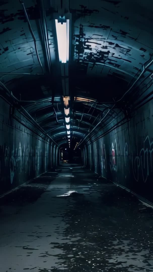 AI Generated Image. Showing vertical video gliding through narrow flickering-tube tunnel lined with graffiti and puddles. Fluorescent tubes flickering overhead, casting cool blue-green tones and creating reflective wet floor. Walls featuring peeling paint, scribbled tags, exposed cables and conduits along arched ceiling, projecting gritty urban mood and deep perspective. Floor showing scattered puddles and worn concrete textures catching light. Suiting use for thriller and horror sequences, urban music videos, cyberpunk visuals, fashion campaigns, streetwear commercials, documentary b-roll, title sequences, game trailers, background loops for events, and social media vertical ads. Providing atmospheric transition clips for editing, mood-building overlays, and cinematic establishing shots. Recommending slow push or steady glide, adding subtle camera shake and ambient tunnel reverb, color grading toward teal or desaturated tones, and layering grain and vignette for extra grit. Delivering vertical format optimized for mobile distribution, TikTok, Instagram Reels, Stories and vertical ad placements.