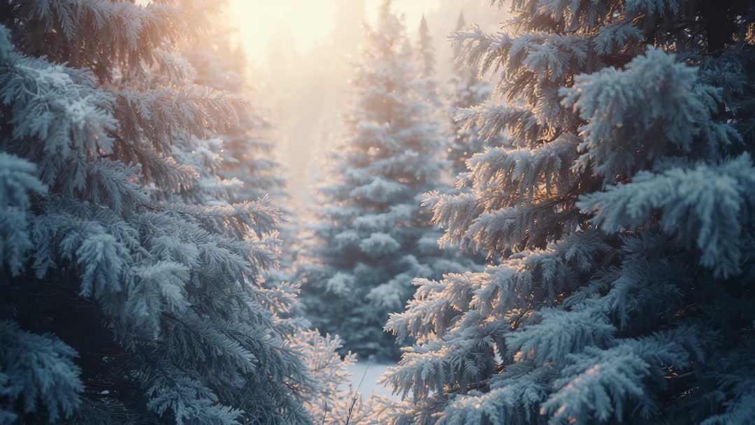 AI Generated Image. Camera glides gently into enchanted snow-laden pine forest as amber sun rises, casting serene glow on frost-covered trees. Ideal for winter-themed projects, holiday backgrounds, nature documentaries, and tranquil scene inserts, evoking peace and quiet contemplation of nature's beauty.