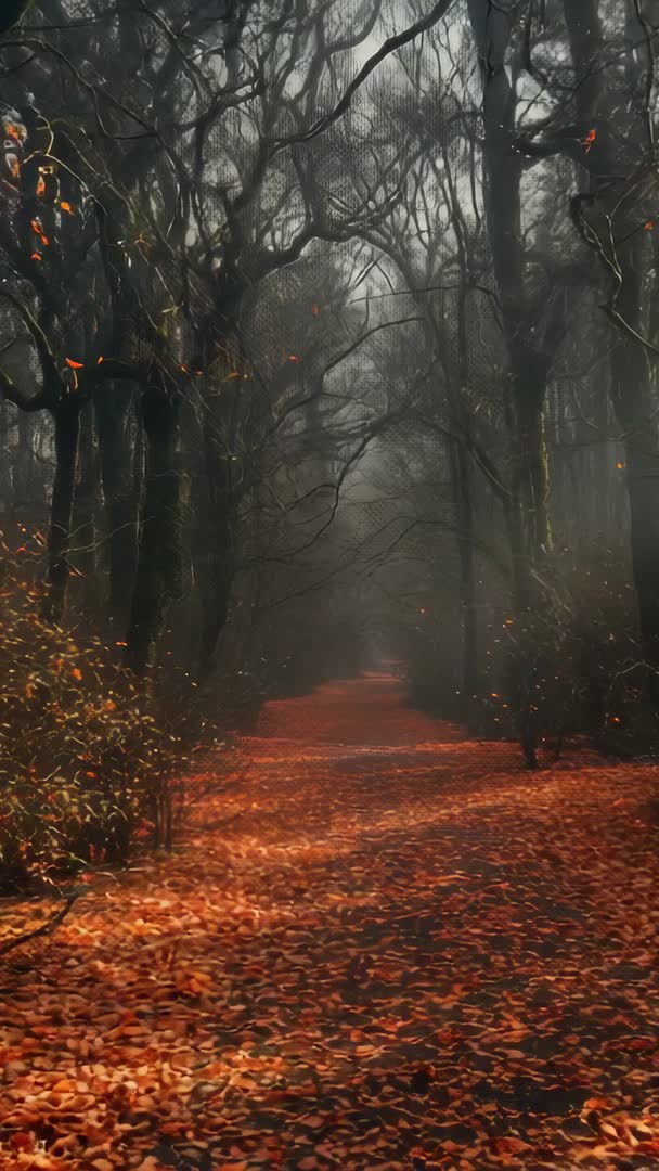 AI Generated Image. Vertical video showing camera gliding along leaf-covered forest path in mist, trunks twisting overhead, embers drifting through air. Creating atmospheric, moody tone with soft fog, deep shadows, warm orange leaves providing contrast. Vertical aspect ratio ideal for social media stories, reels, TikTok, mobile ads, vertical displays. Perfect for cinematic intros, title slates, seasonal promos, nature sequences, Halloween trailers, mindfulness or meditation background. Pairing well with slow dissolve transitions, desaturated greens and warm orange color grade for dramatic contrast. Loop-friendly short glide for ambient background or visual texture in longer edits.