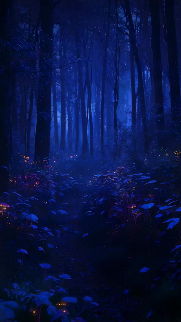 AI Generated Image. Footage panning along central forest path at night, showing tall dark trunks and dense undergrowth lit by soft blue moonlight and clusters of glowing bioluminescent fungi. Mist drifting between trees, tiny particles and firefly-like sparks floating through frame, creating moody cinematic atmosphere and deep sense of mystery. Camera gliding smoothly along trail, revealing layered depth and leading lines that draw viewer into scene. Use for vertical social media clips, app backgrounds, fantasy trailers, title sequences, ambient loops for relaxation or meditation, nature documentary segments, and game environment concept reels. Technical notes: 9:16 vertical video, slow cinematic pan, deep blue color grade, low-light capture with subtle particle effects, loopable end frames for seamless replay.