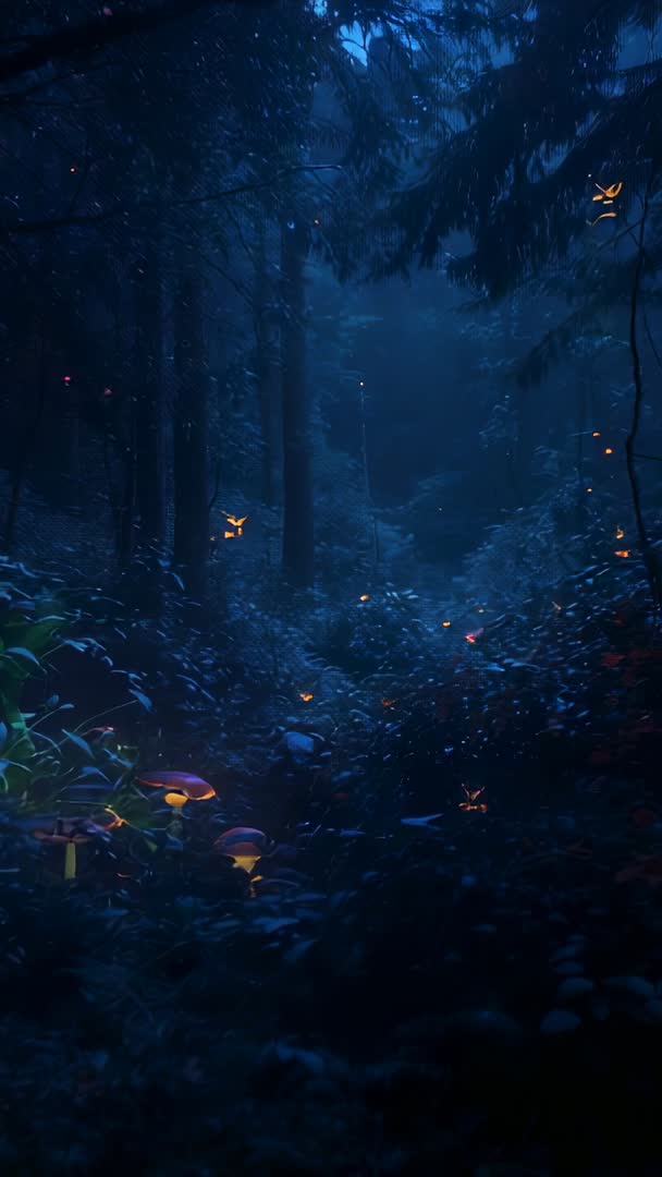AI Generated Image. Gliding through moonlit pine forest with drifting bioluminescent particles and luminous mushrooms dotting understory. Camera moving forward along shadowy path while soft mist lingering between tree trunks, warm amber biolights contrasting cool blue palette for moody cinematic mood. Fireflies and tiny glowing specks floating through frame, creating sense of depth and wonder. Footage working well for vertical social media reels, mobile lock screens, title sequences, teaser trailers, nature documentary openers, fantasy promos, meditation visuals, ambient music backgrounds, game cinematic assets. Use for atmospheric B-roll, seasonal campaign headers, app splash screens, immersive VR previews, storytelling montages. Suggested postproduction tips: emphasize cool tones, boost highlight warmth for biolights, add subtle grain and light haze for filmic texture.