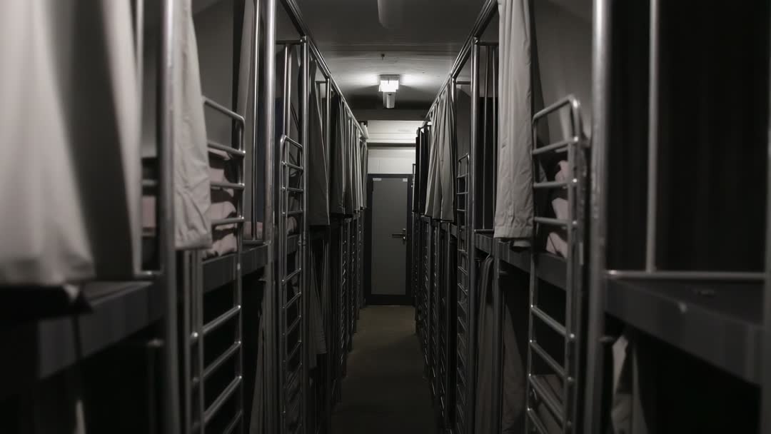 AI Generated Video. Camera gliding forward through narrow aisle of shipboard dormitory lined with stacked metal bunks and privacy curtains. Low, cool lighting creating moody, cinematic atmosphere while tight perspective drawing viewer toward closed door at corridor end. Footage working well for illustrating cramped sleeping quarters, crew life on vessels, hostel interiors, capsule hotel scenes, budget travel narratives, maritime or military accommodation, and urban nomadism. Use for travel documentaries, hospitality marketing, safety briefings, film and TV scenes, online articles about backpacking or life at sea. Clip allowing text overlay in center corridor, looping for ambient background, color grading to warmer tones for friendlier mood, or combining with wide shots for context.