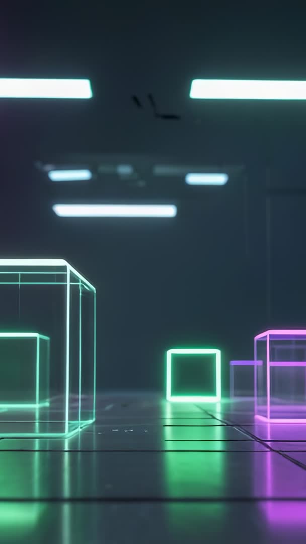 AI Generated Image. Vertical video showing camera gliding forward through neon-outlined cubes over reflective floor, overhead LED panels casting soft cool light. Color palette featuring teal, green, magenta creating moody futuristic atmosphere. Motion slow and smooth, cubes pulsing in sync with ambient beat, reflections adding depth and dimension. Serving as loopable background for tech product reveal, app intro, electronic music visualizer, social media stories, event stage backdrop, website hero. Offering easy customization of colors and pulse timing for brand alignment. Recommending pulse tempo between 60–140 BPM for slow to energetic moods.