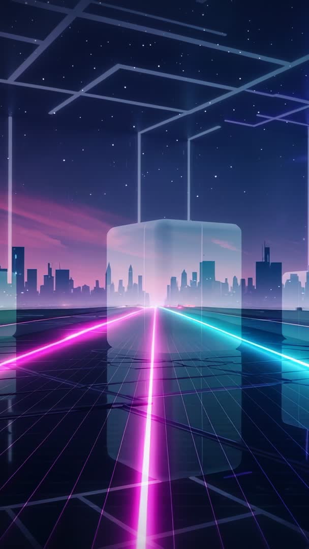 AI Generated Image. Opening shot showing camera gliding along neon grid deck toward glowing pink-cyan cuboid with distant cyberpunk city skyline under starry sky. High-contrast neon palette, reflective surfaces, and strong perspective lines creating sense of speed and depth. Suiting tech product promos, synthwave music intros, cyberpunk trailers, app onboarding clips, social vertical ads, VJ loops, and title openers. Working well for hero backgrounds, transitions, or animated overlays by adding motion blur, bloom glow, and particle effects. Recommending color grading to intensify pink-cyan contrast, layering typographic titles or logo reveals on central cuboid, and looping end-to-start for seamless playback. Delivering cinematic neon mood while optimizing for mobile stories and reels.