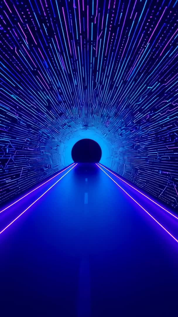 AI Generated Image. Vertical video showing gliding through neon tunnel installation with converging LED floor strips leading toward circular exit. Walls featuring pulsing blue and purple light streaks radiating outward, creating immersive futuristic corridor. Camera maintaining smooth forward motion with strong central vanishing point and symmetrical composition, emphasizing depth and speed. Suiting music visuals, social media reels, event intros, stage backdrops, product launches, tech demos, AR and VR experiences. Working well as looping background, intro clip, or transition element; pairing with synthwave soundtrack and neon-glow color grading enhancing mood. Editing tips: trimming to vertical mobile duration, adding motion blur for speed, looping seamless segments, overlaying bold headlines with contrasting fonts, adjusting exposure to preserve neon highlights. Ensuring high-contrast text placement along darker central lane for legibility; extending loop for longer projections. Mood tags: futuristic, hypnotic, energetic, mysterious.