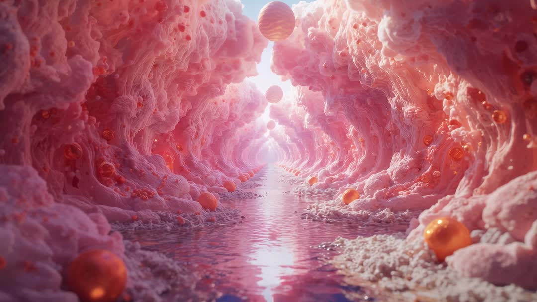 AI Generated Image. Gliding camera through cavernous pink foam tunnel over mirror-like water, approaching distant luminous opening dotted with drifting orange orbs. Featuring soft pastel palette, intricate organic textures, glossy surfaces, and subtle light scattering for cinematic depth. Creating surreal dreamlike journey suitable for abstract storytelling, music video intros, cinematic title sequences, science fiction scenes, meditation visuals, and background loops for digital signage. Providing loop-friendly motion, easy color grading, and negative space for overlaid text or graphics; ideal for branding spots, social media reels, projection mapping, and experimental art installations.