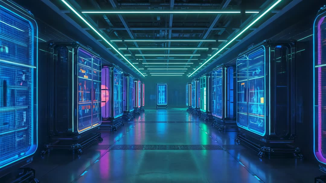 AI Generated Image. Gliding camera traversing central aisle of neon-lit data center, revealing rows of glowing server racks and mirrored floor reflections. Overhead LED grid casting cyan and magenta highlights, creating cinematic futuristic mood and strong symmetry. Smooth dolly push transitioning into steady tracking movement, delivering immersive parallax and long depth of field. Featuring reflective flooring, transparent cabinet panels, and pulsing LED accents for dynamic visual rhythm. Serving as background for tech product promos, cybersecurity campaigns, AI concept videos, startup website hero sections, broadcast bumpers, VJ loops, corporate IT presentations, training materials, and keynote openings. Providing loop-friendly motion, adaptable color grading, and widescreen composition for use in 4K edits, motion graphics, advertising, and social media reels.