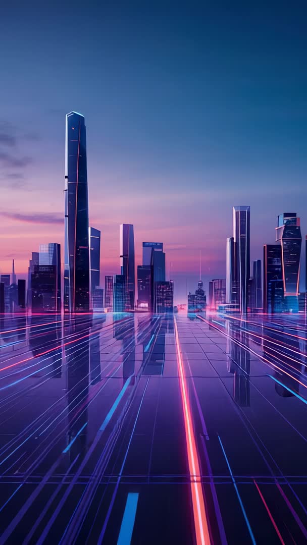 AI Generated Image. Vertical cinematic video following gliding camera over glossy reflective plaza toward neon-lit towers at dusk. Palette blending pink, purple, blue creating moody futuristic atmosphere. Motion trails and light streaks producing sense of speed and digital energy. Visuals emphasizing glass surfaces, tall towers, and long perspective lines for immersive depth. Ideal for title sequences, tech product reveals, app promotions, sci-fi trailers, corporate brand intros, virtual event backgrounds, social media reels, smartphone wallpapers, website hero loops. Suitable for advertising, editorial features about urban innovation, music video backgrounds, concept art showcases. Footage allowing easy color grading and overlaying graphics or lower third text thanks to wide sky area and clean foreground lines.