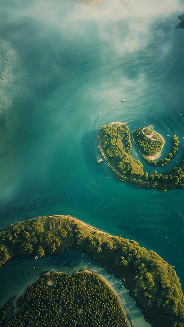 AI Generated Image. Showing gliding vertical drone sweeping over curved island chain and concentric reef rings in vibrant turquoise water. Featuring visible sandbars, winding coastline and dynamic boat wake trails that add motion and scale. Ideal for travel and tourism promos, illustrating island escapes, eco-tourism, private resort marketing and adventure boating content. Working well for social media vertical ads, mobile wallpapers, travel vlogs, tourism websites and editorial pieces about marine conservation. Allowing easy cropping for portrait mobile formats and overlaying text or branding for title cards. Pairing with slow ambient soundtrack and smooth transitions to emphasize tranquil motion and wide open ocean feel. Providing high contrast between lush green land and clear water for striking color grading and cinematic edits.