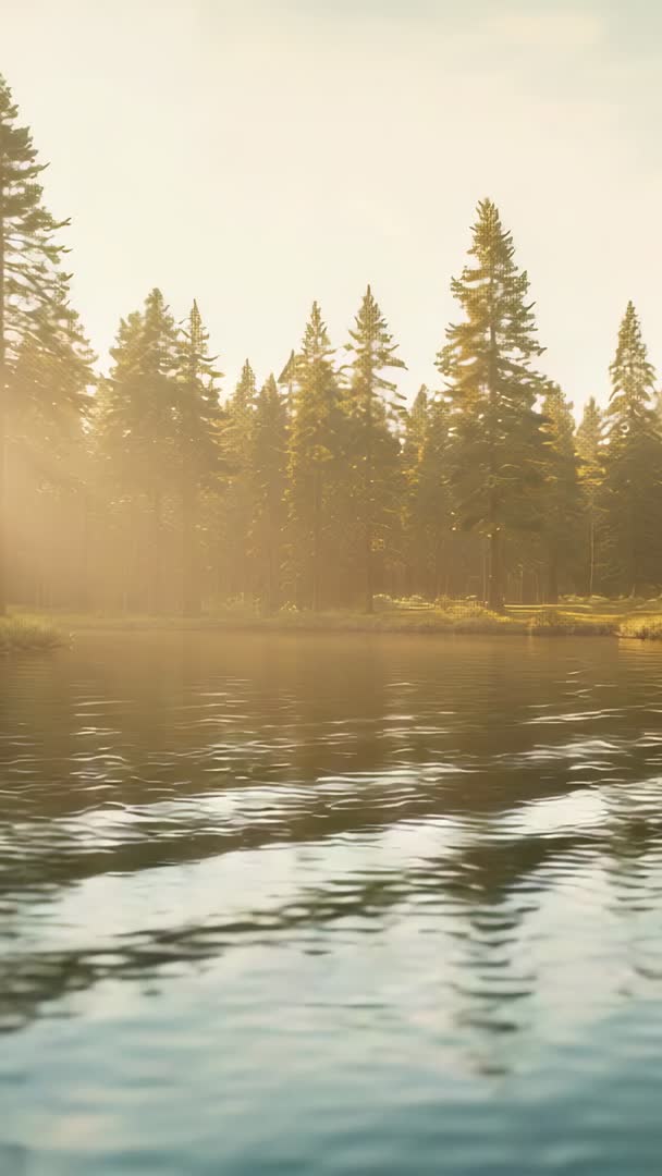 AI Generated Image. Showing gliding vertical camera movement over calm lake surface with gentle ripples and warm golden light filtering through pine canopy. Mist drifting above water and soft reflections shimmering on surface, creating tranquil atmosphere for peaceful storytelling. Serving as ideal vertical background for social media reels, mobile wallpapers, meditation apps, travel promos, wellness retreat ads, and nature documentaries. Enhancing brand visuals for outdoor gear, eco tourism, retreat marketing, or calming transitions in video edits. Providing room for overlay text and logo placement along upper sky area and lower water area while keeping composition balanced. Suggesting color grade with warm tones, soft contrast, and subtle vignette for cinematic mood.