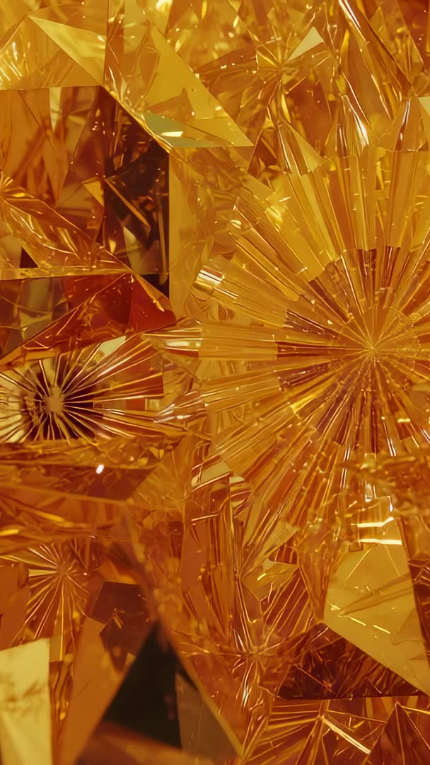AI Generated Image. Showing vertical close-up of glinting gold faceted panel casting radial starburst glints across prismatic metallic surfaces with subtle camera shift creating parallax motion. Providing loopable motion clip optimized for vertical video use on Instagram Reels, TikTok, Snapchat, mobile ads, and social stories. Working well as shimmering background for luxury product reveals, title screens, motion graphics, event promos, holiday campaigns, and stage visuals. Offering high contrast highlights and warm gold tones matching premium branding, packaging mockups, website hero sections, and print layouts. Suggesting use as overlay or transition element, abstract texture fill, VJ loop, or decorative accent in editorial and commercial videos.