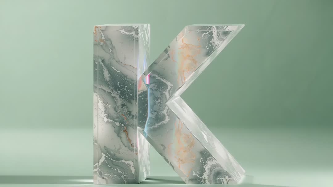 AI Generated Image. This visual focuses on a large, 3D marble-like letter K with a striking reflective quality, accented by a gentle green gradient in the background. The glinting light travels down the edge, adding a touch of sleek elegance. Suitable for use in design projects that emphasize modern aesthetics and minimalist art. Ideal for creative works, branding materials, or decorate contemporary spaces where abstract and sophisticated elements are desired.