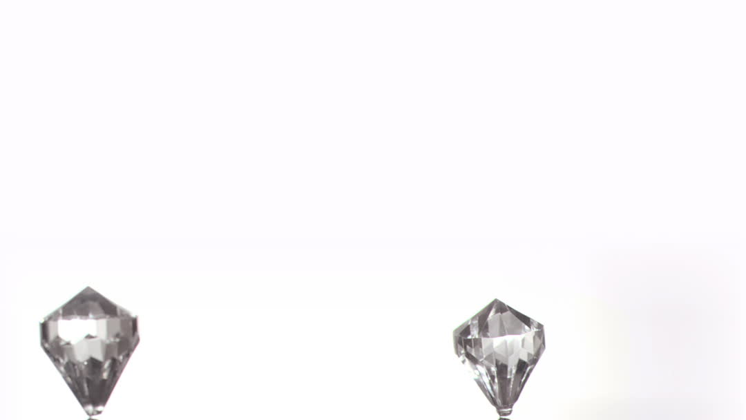 Two sparkling diamonds, precisely cut and elegantly turning in slow motion, capture attention against a pristine white backdrop. Each facet catches the light, creating a play of reflections that showcases their clarity and brilliance. This visual is ideal for luxury branding, advertisements for high-end jewelry, and content highlighting elegance and beauty.