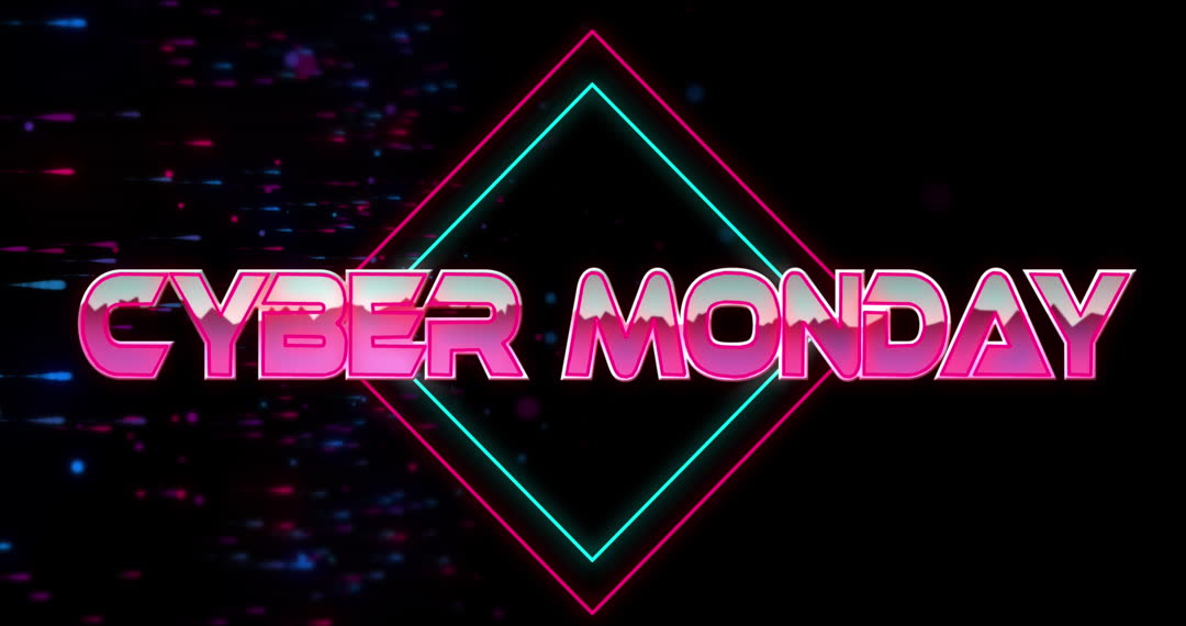 Glitch effect animation of 'Cyber Monday' text with neon hues evokes a futuristic and energetic tone, ideal for promoting digital sales events. This visual can be used in marketing campaigns, online advertisements, and social media promotions to attract customers during seasonal retail shopping sprees.