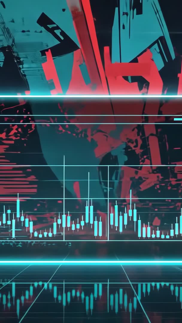 AI Generated Image. Vertical loop featuring glitch revealing of red and teal geometric panels, neon grid, pulsing horizontal lines and candlestick chart elements. Suited for tech and finance projects, social media stories, mobile ads, app intros, broadcast openers and VJ visuals. Motion graphics working as dynamic background for live streams, product launches, investor presentations and corporate tech promos. Colors combining neon teal and red for high-contrast cyberpunk look. File optimized for vertical 9:16 delivery, loopable animation and easy timing for beat-synced edits. Tips for use: overlaying logo and lower thirds, adding headline text, syncing cuts to pulses, applying color grade to match brand palette.