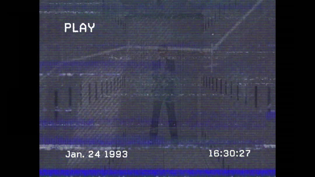 This visually captivating video frame features a glitchy VHS aesthetic capturing a person standing in the center of an industrial hall. The scene is layered with distortion lines and time stamps reminiscent of early 90s video technology, imbuing it with a nostalgic and retro-futuristic feel. Perfect for projects related to digital art, fascination with retro technology, or to enliven video backgrounds focused on glitch art and visual experiments. Ideal for music videos, creative media content involving retro themes, or multimedia installations exploring digital depreciation and restoration.