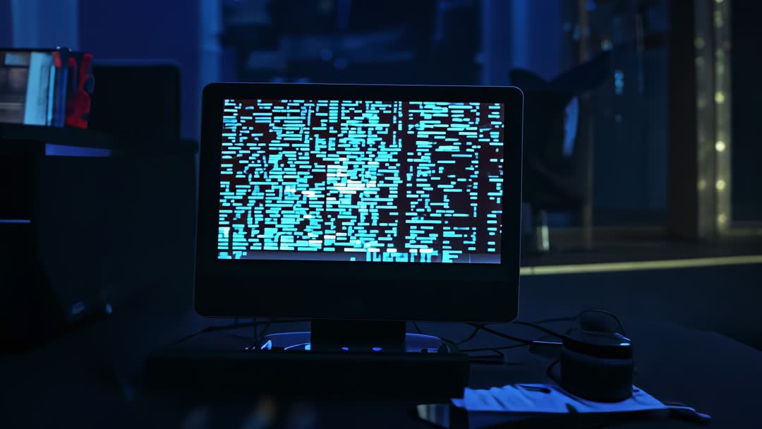 AI Generated Video. Scene features computer monitor displaying glitching code on a dark server desk, conveying a theme of cybersecurity and digital security challenges. Useful for content on technology warning signs, data processing anomalies, or tech office environments stressing the importance of secure data transmission and problem-solving in IT infrastructures.