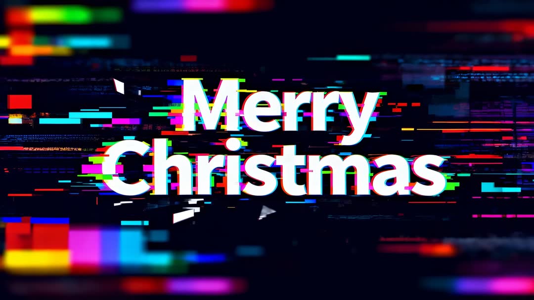 AI Generated Video. Featuring bold two-line Merry Christmas typography undergoing RGB offset and colorful glitch bars across dark digital canvas. Neon chromatic aberration and scanlines shifting, creating high-energy cyberpunk holiday vibe. Motion-friendly composition centering text for clear overlay placement and loop-ready transitions. Ideal for holiday tech promos, streaming intros, social media reels, VJ loops, electronic greeting animations, club flyers, website hero headers. Recommend pairing with upbeat electronic soundtrack, adding subtle falling snow overlay for contrast, and creating seamless loop between 6 and 12 seconds. Suiting 1080p and 4K projects, supporting color grading, speed ramping, and alpha-channel title overlays for versatile delivery.