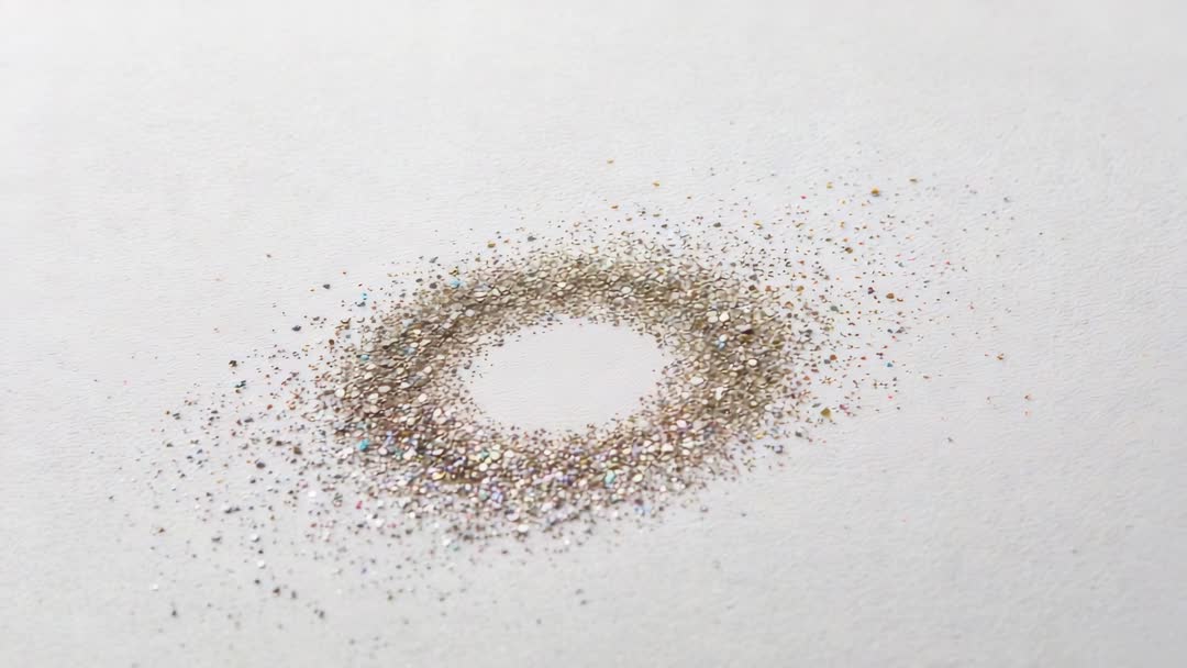 AI Generated Image. Close-up video showing glitter forming circular ring and slowly dispersing across white paper. Macro focus capturing shimmer and reflective metallic flakes catching ambient light. Providing empty center area for overlaying text, logo, or lower-third graphics. Working well for motion graphics, beauty packaging reels, craft tutorials, social media promotions, minimalist brand intros. Loopable slow-motion segment offering gentle particle movement and natural dispersion patterns. Color palette featuring soft silver, warm gold, and holographic flecks for elegant shimmer. Usage ideas: cropping for hero banners, masking for particle overlays, blending for glitter transitions, pairing with ambient music or soft voiceover.