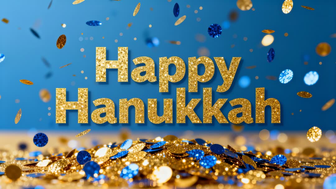 AI Generated Image. Video clip showcasing glittering gold 'Happy Hanukkah' text centered over reflective surface, blue and gold confetti falling, glittering gelt coins piling in foreground, soft bokeh lights sparkling in background. Creating warm festive mood with rich blue and metallic gold palette, leaving generous negative space for headlines and lower thirds. Suited for social media greetings, animated e-card intros, website hero banners, email headers, TV spots, retail displays, event promotions, digital invitations and party invitations. Allowing easy text replacement, looping background creation, color grading and cropping for square or vertical formats, plus music or voiceover overlays. Ideal for holiday marketing, community center announcements, synagogue event promos, family greeting messages and seasonal advertising.