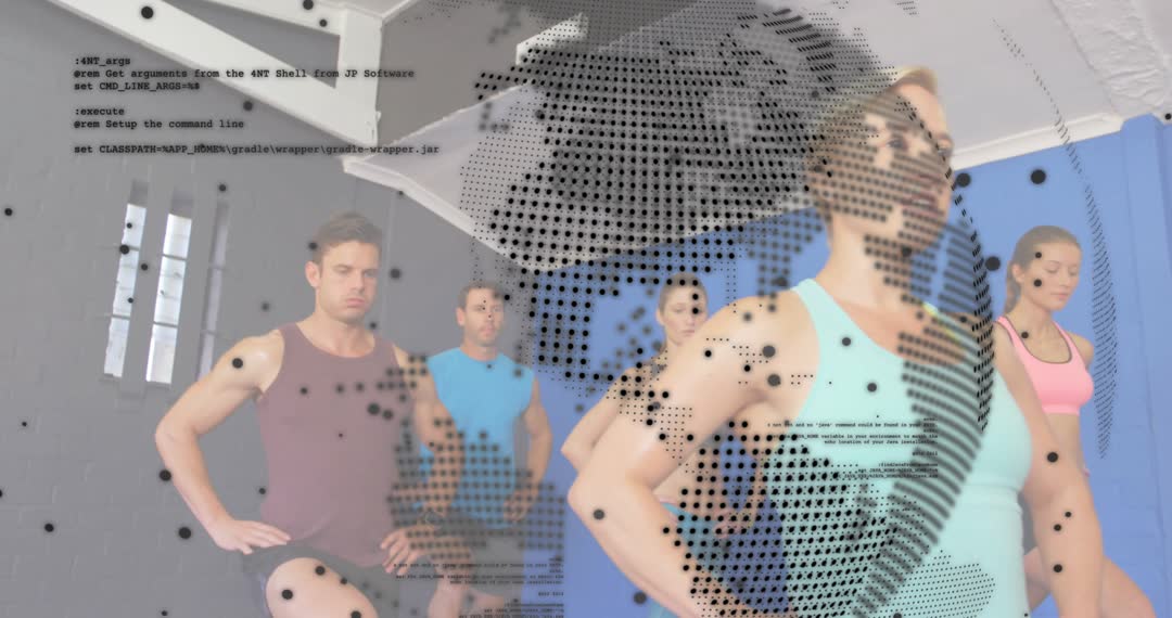 Dynamic video showcasing a global animation overlay as a group of individuals in a studio perform lunges in unison. Highlights teamwork and a modern approach to fitness. Useful for promoting group fitness classes, collaborative wellness events, or international fitness campaigns.