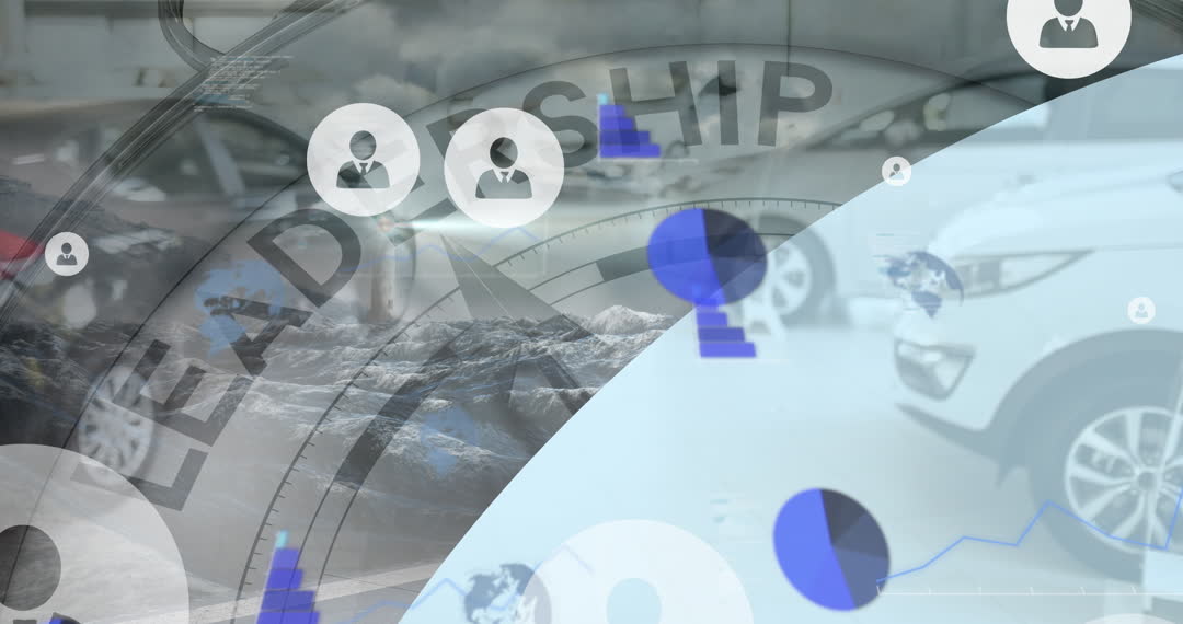 Visual showcases the convergence of global automotive business with digital technology through floating icons, graphs, and car videory, emphasizing leadership and innovation. Ideal for presentations on automotive trends, technology integration in cars, or business networks in the automotive industry. Suitable for use in marketing materials or tech-focused automotive events.
