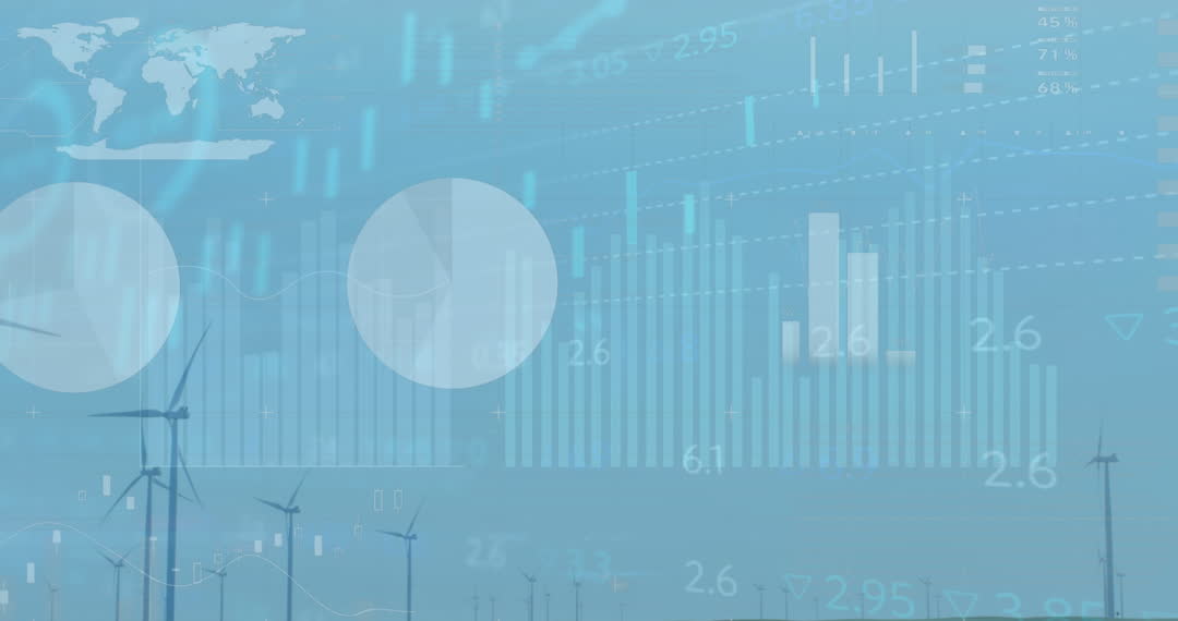 Blending elements of technology, finance and renewable energy, the design incorporates wind turbines against a backdrop of digital data and statistics. Useful for presentations or content related to the intersection of sustainable energy and finance, global market analyses, or business development in the renewable sector.