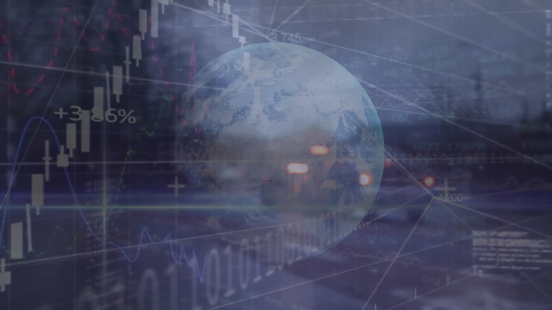 This video depicts the integration of binary coding and financial data around a globe, symbolizing global business and technological progress. Suitable for use in presentations and articles on digital finance, technological integration in global markets, or innovation strategies in business environments.