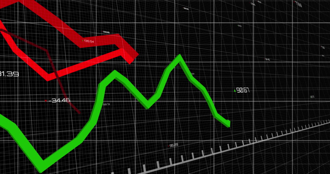 Animation shows fluctuating red and green lines representing trends in financial data over a digital grid background. Ideal for illustrating concepts in global finance, data analysis, stock market fluctuations, and financial technology. Use for business presentations or educational materials.