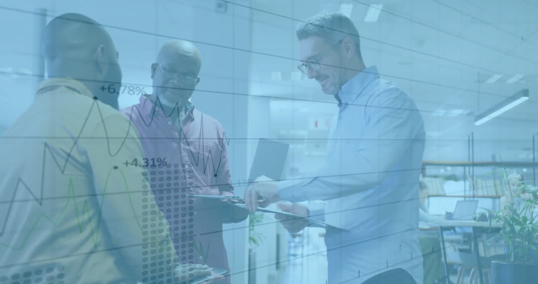 Business professionals working together in a modern office with an overlay of financial data and graphs. Ideal for illustrating concepts of teamwork, financial analysis, global business collaboration. Suitable for presentations, websites, and content related to finance, business strategy, and data-driven operations.