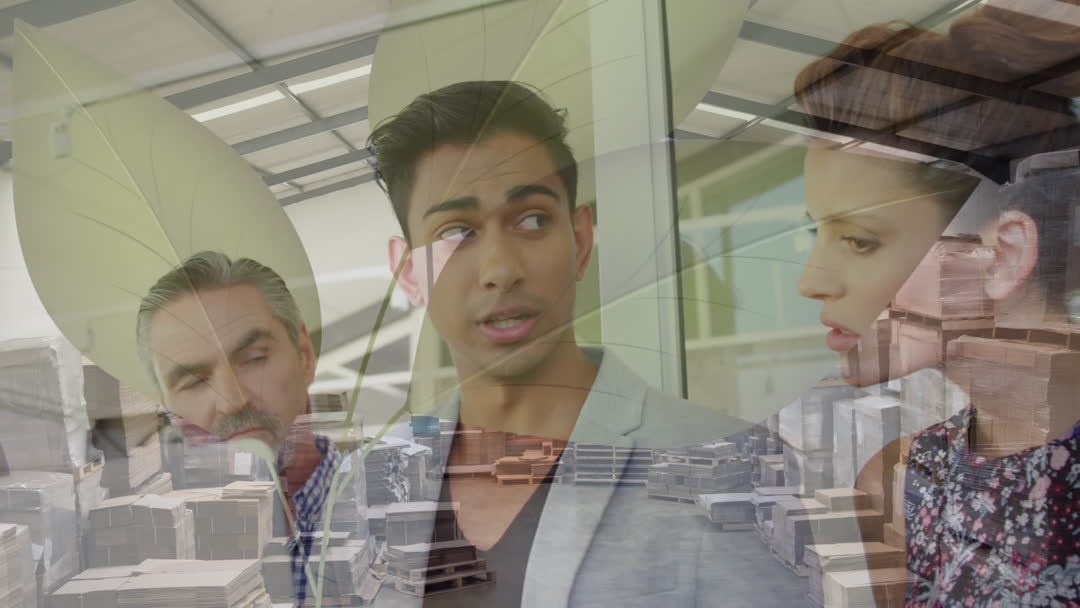 Overlay of business professionals discussing within warehouse setting symbolizes global collaboration and efficient supply chain management. Ideal for use in presentations on international business strategy, logistics operations, or team management in dynamic industrial contexts.