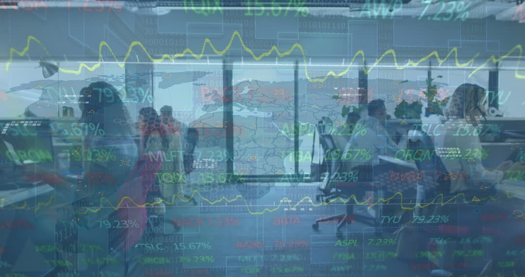 Scene showing diverse professionals in an office setting engaged in collaborative work, with an overlay of financial data and a world map. This video represents the merging of global business strategies and financial analytics, useful for articles or presentations focusing on international finance, data-driven decision making, and multicultural teamwork.