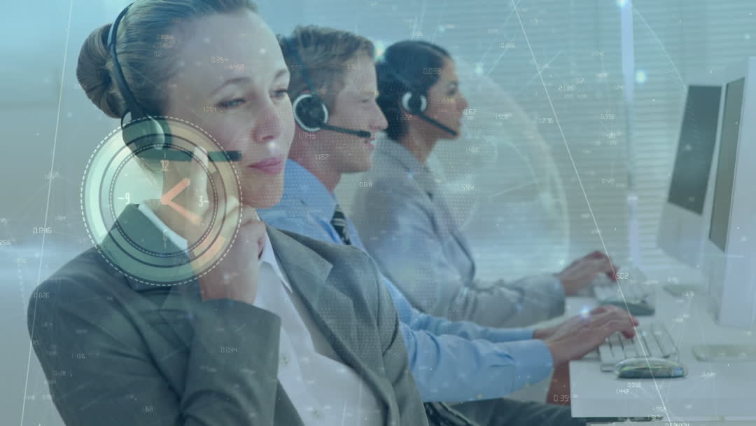 Depicts a team of diverse business professionals using phone headsets, integrated with an animated overlay representing data and global business concepts. Ideal for illustrating themes of global communication, customer service operations, or technology integration in business for presentations, marketing materials, or tech-related content.