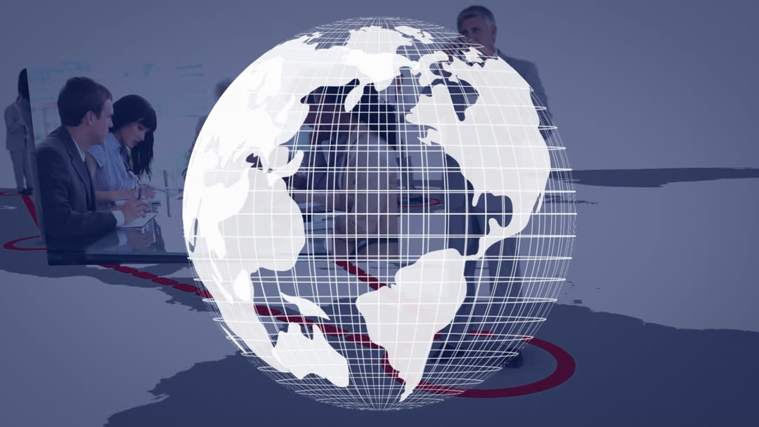Animation features overlay of rotating globe on diverse team discussing strategy during meeting, suggesting themes of worldwide communication and business connectivity. Image is suitable for presentations on globalization, international trade, and networks.