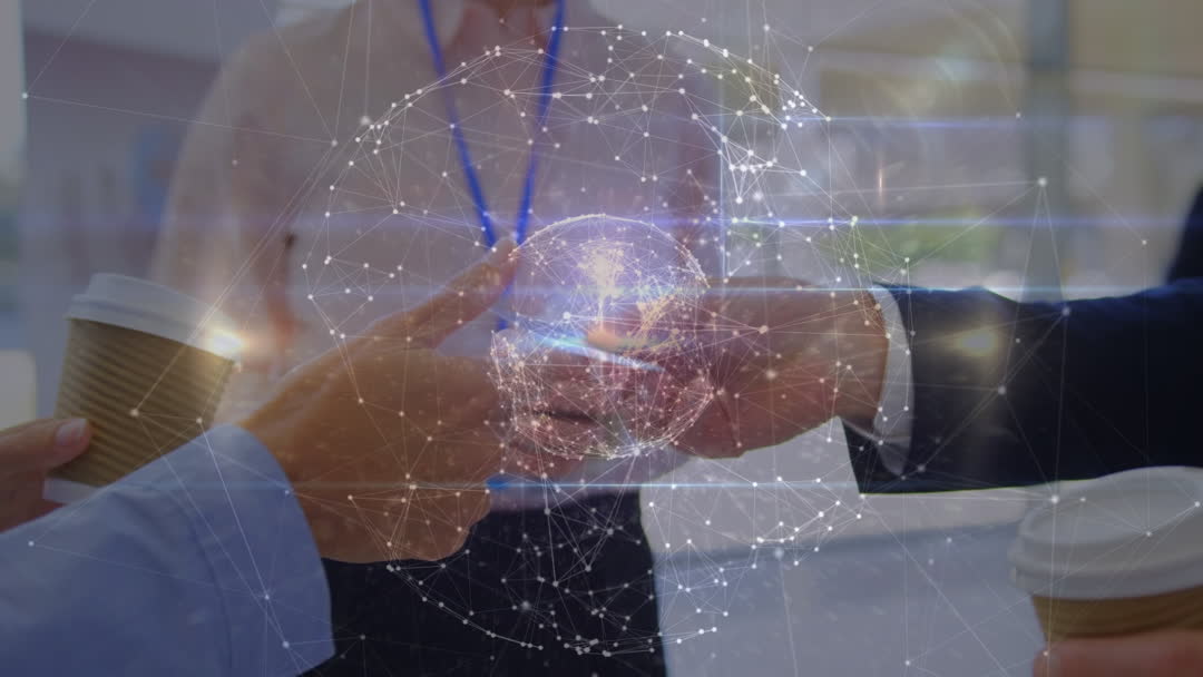 Image illustrates businesspeople engaging in a collaborative gesture alongside a digital representation of interconnected global technology, signifying teamwork and networking. Suitable for content about global business strategies, technology-driven collaboration, and modern professional practices.