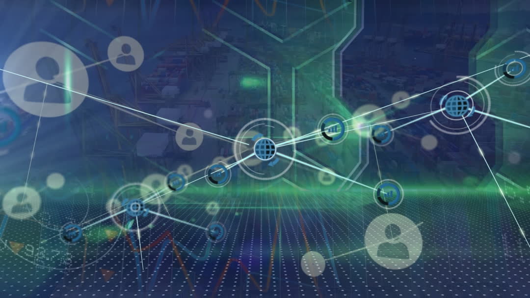 This animated visual illustrates the concept of global business connectivity within a warehouse setting. It features interconnected networks symbolizing digital interfaces crucial to logistics and transportation. Ideal for illustrating technology in supply chains, digital transformation in warehouses, and innovations in logistic operations.