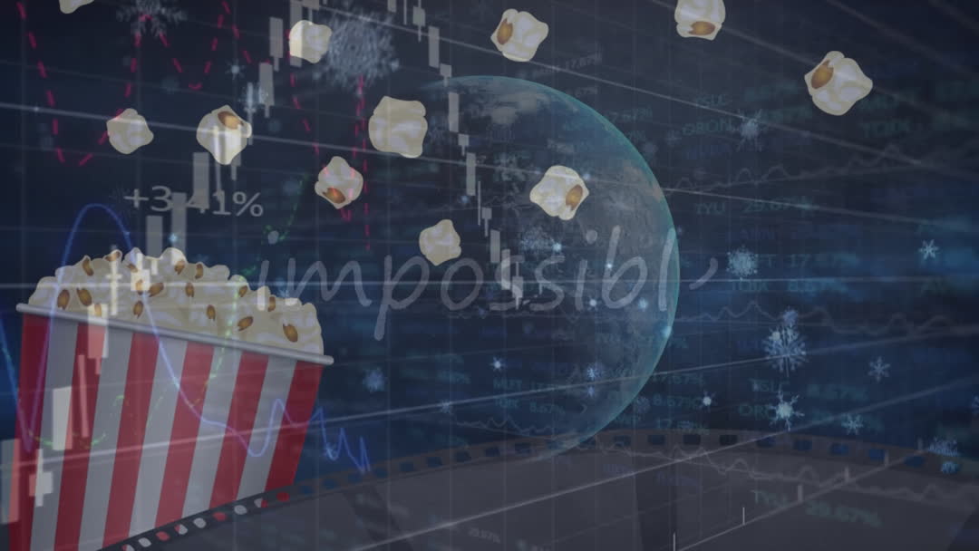 This visually engaging artwork blends elements of global business and entertainment. Using symbolic icons like Earth, layered digital data graphics, and popcorn hints at the crossover between film and corporate analytics. Suitable for promotional materials related to international films, financial data analysis tools, corporate presentations seeking artistic flair, or educational use highlighting global market intricacies intertwined with culture.