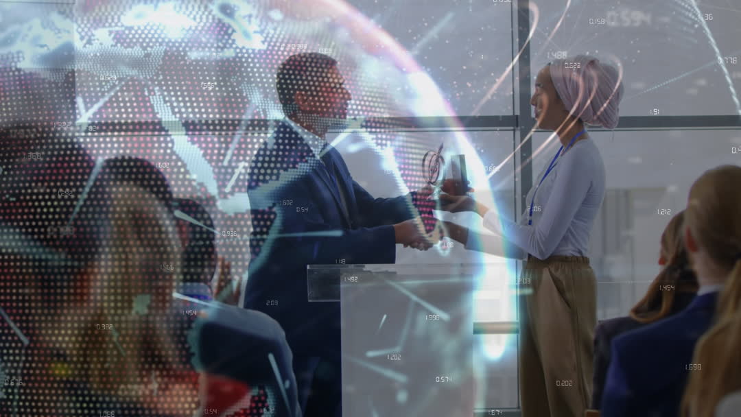 Diverse professionals engaged in business data exchange, with a dynamic animation of a globe. Implies global business reach, technological innovation, and collaborative partnerships among business people. Useful for corporate presentations, business seminars, and technology conference themes showcasing teamwork and connectivity in the modern digital world.