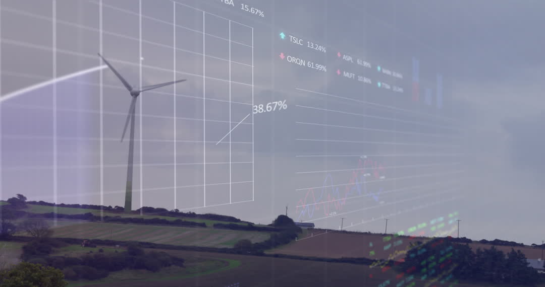 Visualization of statistics and data processing shown over fields with wind turbines represents the intersection of technology and clean energy. Perfect for illustrating concepts of renewable energy analysis, business growth, environmental technology, or financial analytics in sustainable practices.